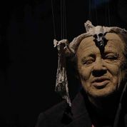 Single actor, Patrick Michaelis (who has to be Giacometti), suffers sand pouring over his head, then a wee demon of a puppet- familiar on his skull, then a yellow spider, then outstretched, skeletal arms protruding as if from the back of his coat. Did I appreciate the following elucidatory text on a screen somewhere: “A blind man extends his hand in the void (in the dark? In the night?/The days pass and I dream of catching, stopping that which flees”? No, I did not; Giacometti’s 1952 haiku-like poem probably was evident somewhere but there were too many available options: actor’s voice, electronic voice, chalkboard, tablet screen, revolving PC monitor, big screen. And the music plays all the while: on conch, muted trombone, synthesiser, and those impressive alpenhorns.