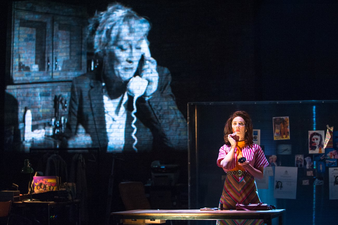 There are no hands to the big clock in the incident room, which does point to alienation theory, but up come the sound cues and they appear, chronicling Lise’s known movements from hotel lobby to department store . There’s live mapping of her taxi on the large upstage screens while handheld TV cams relay fraught close-ups. You would think that little is hidden on such a tech-savvy set but as to why Lise acts the way she does there’s not much to go on, which is probably the existential point. Are we watching an object/abject study in self-destruction or an introverted and skittering operetta, complete with CS gas? Composer and sound designer Philip Pinsky uses mild jazz in ironic counterpoint to the spiky and alarming story. Did he, I wonder, smile at the desperate lyrics of the Sniff ‘n’ The Tears’ hit single Driver’s Seat (1979), where “She had another way of looking at life”? Accept stunned recall of Elizabeth Taylor & Ian Bannen in film-of-the-book Identikit of 1974 and you can see that Spark’s work is heading straight for Thelma and Louise some twenty years down the road, except that Lise has no buddy to go over the edge with.