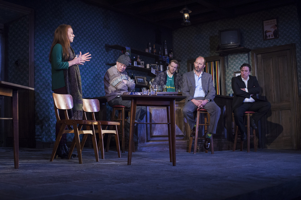 ‘The Weir’ was written in 1997, enjoyed immediate success and has attracted lyrical approval thereafter. Personally, I’ll play safe and just recognise how companionable a piece it is. You will not want to let these characters go home in the rain*. Single men, who know each other well, have gathered hospitably, stood each other a drink (or two), and have talked idly. However, there is the one woman amongst them and it’s Valerie who’s channeling the hard stuff.