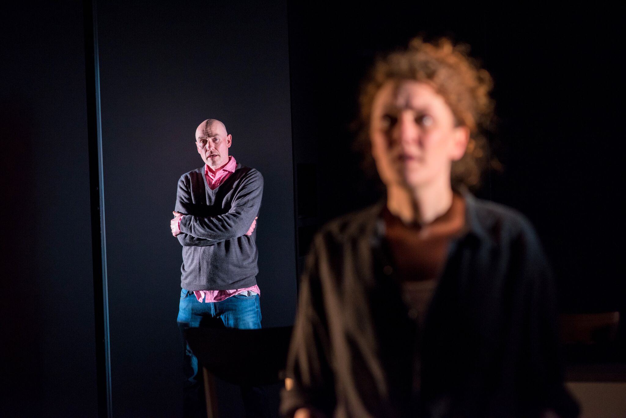 It could not happen to a more ordinary, youngish, couple, which is precisely the point. We even have a Glasgow address: 65 Kelvindale Road – and Joshua (3) goes to Nursery and Granny Morven (Rory’s mother) helps out a lot, to begin with. First it’s the baby monitor and then it all goes wrong, which is where is the creative team get it just right. There’s a broad set, minimally dressed: a table and three chairs stage left, and a garden swing stage right; large rectangular panels, one of gauze, at the back. Colours are muted, contemporary greys and creams. The exceptional lighting design by Kai Fischer marks off areas that quickly isolate and focus attention. Various Strangers cast shadows, open to frightening doubt, that contrast with the chilling white of Maddy’s psychiatric stay. Michael John McCarthy’s music is spare and quietly ominous while Zinnie Harris’ direction is one keen judgement call after another. The overall effect is a silent ‘House’ in the grip of a familiar, media churned nightmare that cannot be shaken off.