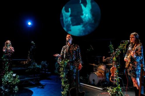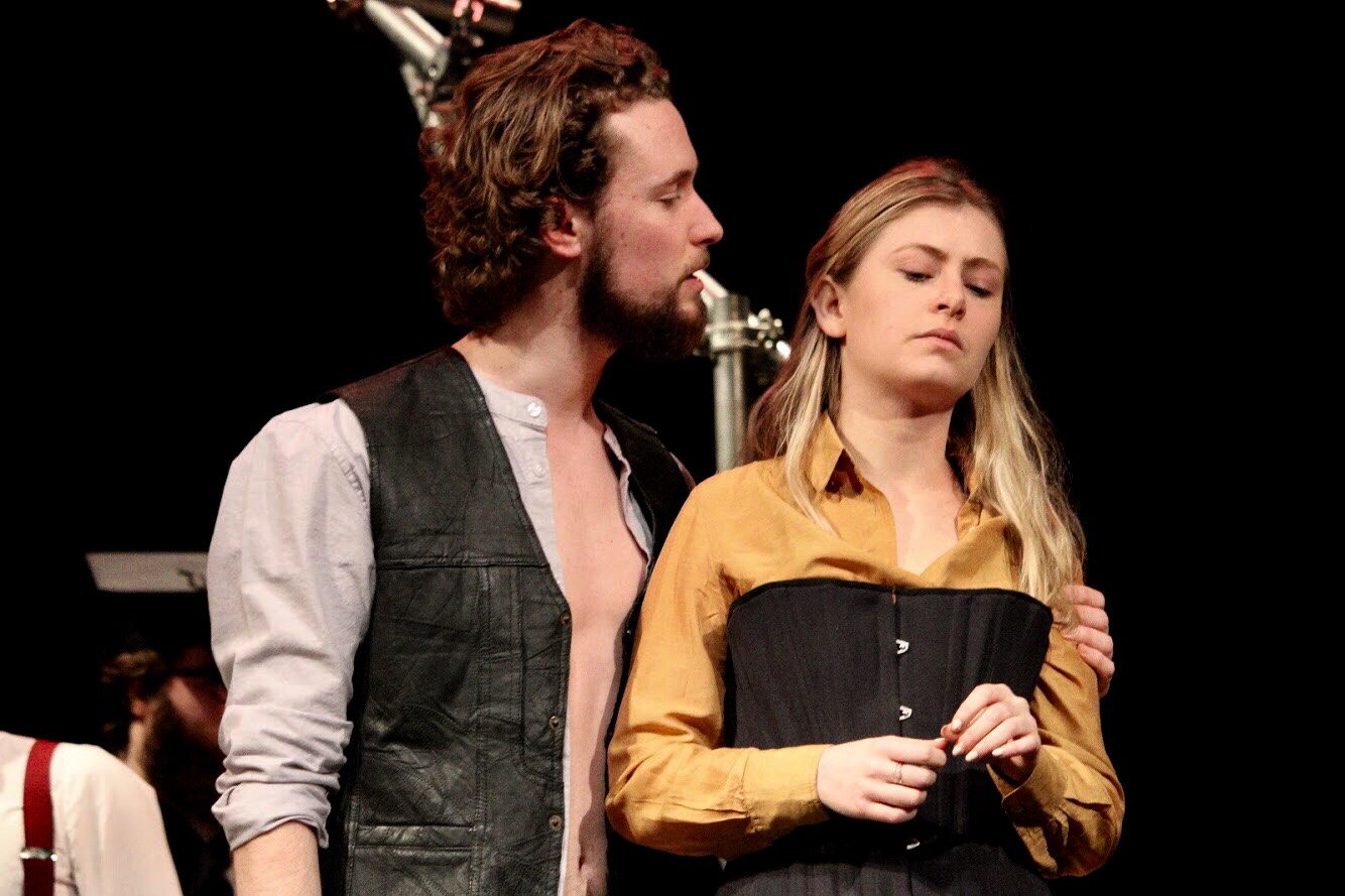 If Bosola surprises, the Duchess inspires. She opens the play alone, centre stage, in front of a microphone and her audience. Her own story closes in around an excellent performance by Kirsty Stuart. Amused but all too aware of her brothers’ appalling misogyny, she is mischievous and loving with Antonio, craving and then burping apricots during her pregnancy, and heroic – immortal – at her end. The two other female parts, Cariola (Fletcher Mathers), Julia (Leah Walker) suffer, fall – and rise – with her.